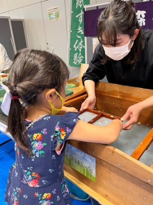 地域の父兄と児童が、体操着と国内産楮のパルプで手すきの