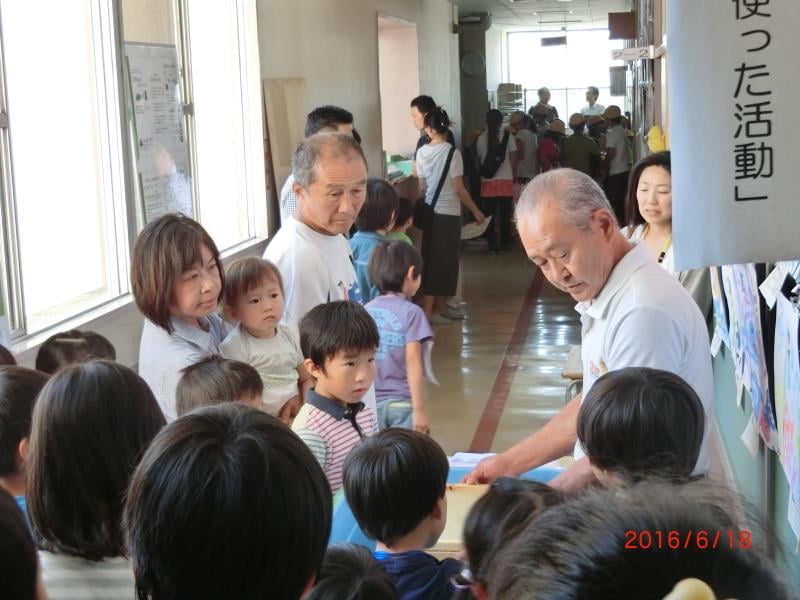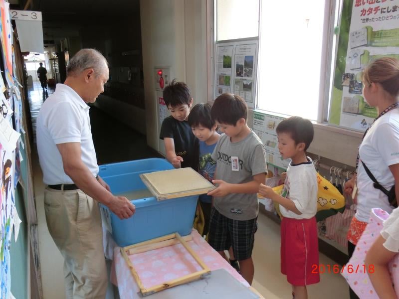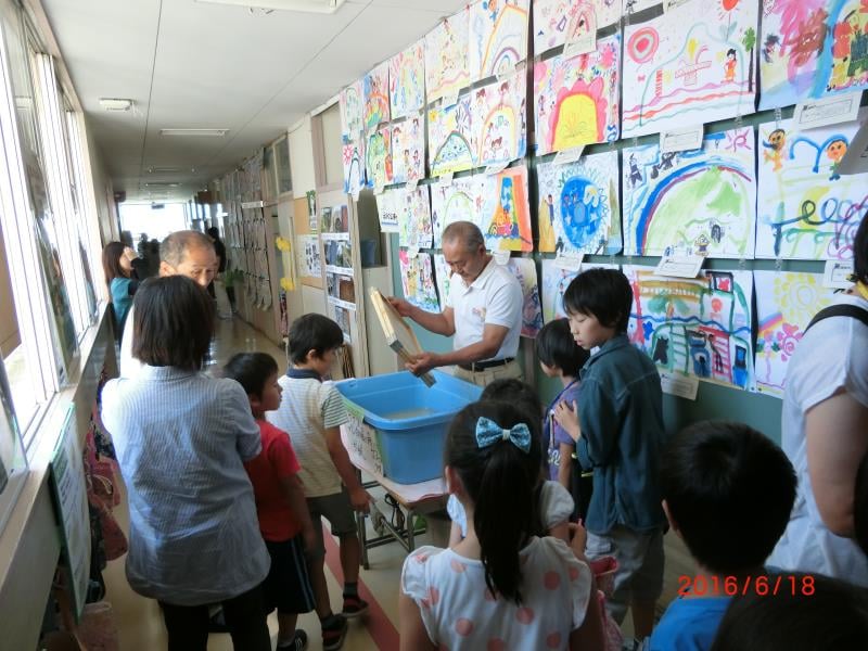 2016/6/18 埼玉県越谷市立大袋東小学校にて、第18回越谷市立大袋東小学校エコフェスティバルが開催されました。森を守る紙の会の講演、紙漉きの実演を行いました。100名以上の小学生たちが集まり、興味深く聞き入ってくれました。